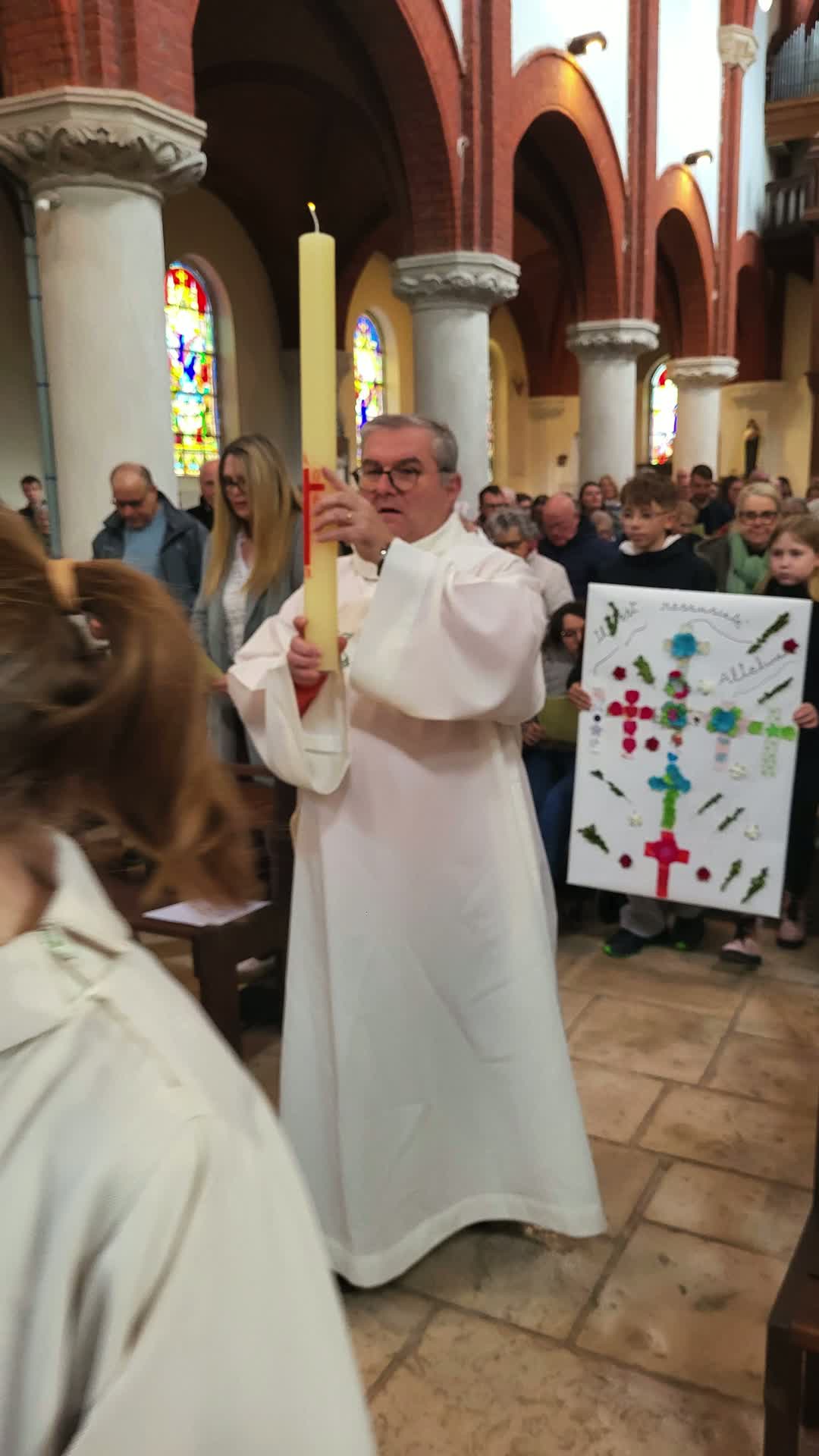 La nuit de Pâques, avec la Vigile Pascale, a été le point d’orgue de notre Triduum. Dans l’obscurité de l’église Saint-Pierre de Fourmies, le feu nouveau et le cierge pascal ont symbolisé la lumière du Christ ressuscité, qui dissipe les ténèbres.